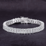 Bransoletka Double Row Tennis z moissanitami szlif okrągły – Round to elegancka biżuteria ze srebra próby 925. Dwa rzędy moissanitów o barwie D i czystości VVS1 tworzą spektakularny efekt blasku, 2,5 razy silniejszego niż diament. Idealna na wyjątkowe okazje oraz jako luksusowy prezent.