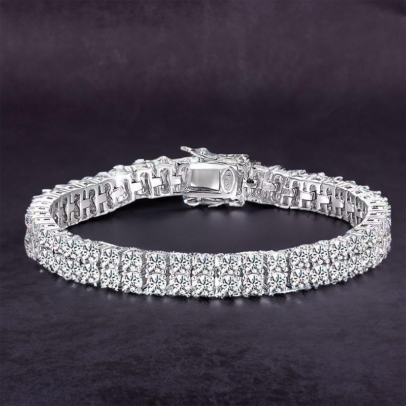 Bransoletka Double Row Tennis z moissanitami szlif okrągły – Round to wyraz luksusu i elegancji w najbardziej spektakularnej formie. Dwa rzędy perfekcyjnie osadzonych moissanitów o barwie D i czystości VVS1 tworzą intensywny blask, który wyróżnia się 2,5 razy silniejszym ogniem niż diamenty.