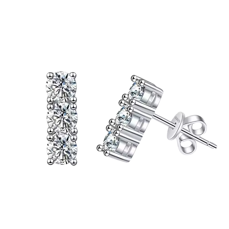 Kolczyki Trzy Klejnoty to hołd dla klasyki zaklętej w nowoczesnej formie. Trzy perfekcyjnie oszlifowane moissanity w szlifie Round tworzą harmonijną linię światła, która zjawiskowo odbija każdy promień, przewyższając diamenty intensywnością blasku.