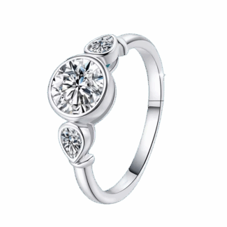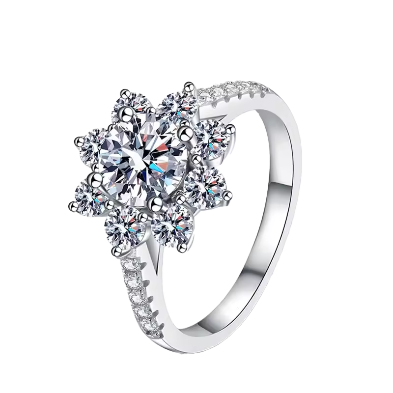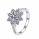 Pierścionek Flower z moissanitami szlif okrągły – Round to olśniewająca kompozycja inspirowana naturą. Centralny moissanit o barwie D i czystości VVS1 został otoczony mniejszymi kamieniami, które tworzą efekt rozkwitającego kwiatu, pełnego blasku i elegancji.