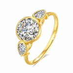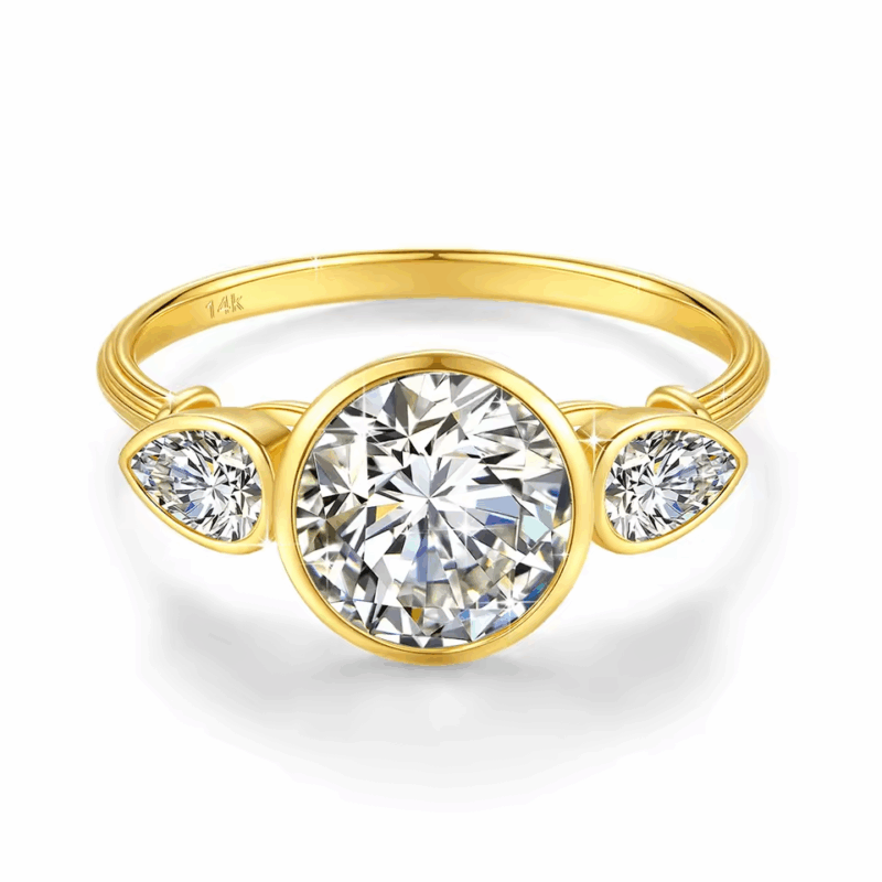 Nova to pierścionek, który zachwyca symetrią i wyjątkową symboliką trzech kamieni. Wykonany z prawdziwego złota 14K (585), łączy klasyczny urok z nowoczesnym stylem. Centralny moissanit o masie 2ct w szlifie brylantowym otoczony jest dwoma mniejszymi (0.5ct) kamieniami w szlifie Pear (łezka), które pięknie odbijają światło, tworząc harmonijną kompozycję pełną blasku.