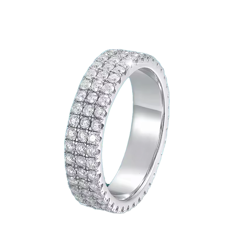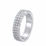 Pierścionek Pavé z moissanitami szlif okrągły – Round to biżuteria, która zachwyca swoim bogactwem i luksusowym charakterem. Cała powierzchnia obrączki została wysadzana rzędem drobnych moissanitów o barwie D i czystości VVS1, które olśniewają blaskiem i tworzą spektakularny efekt świetlistości.
