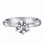 Pierścionek Soliter Classic z moissanitem szlif okrągły – Round to wyjątkowe połączenie klasyki i nowoczesnych detali. Centralny kamień o barwie D i czystości VVS1 osadzony w sześciokrotnej oprawie zachwyca swoją brylancją, której ogień jest 2,5 razy silniejszy niż diamentu.