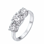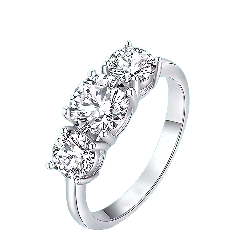 Pierścionek Trilogy z moissanitami szlif okrągły – Round to wyjątkowa biżuteria o głębokiej symbolice – trzy kamienie reprezentują przeszłość, teraźniejszość i przyszłość, czyniąc go doskonałym wyborem na zaręczyny, rocznicę lub inne szczególne okazje.